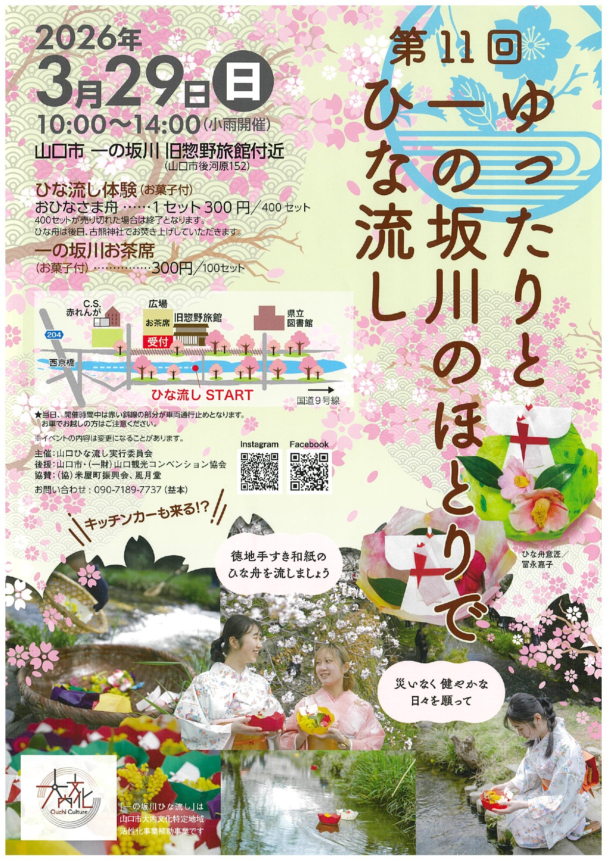 会場は一の坂川旧惣野旅館付近で、ひな流し体験のほかお茶席も設けられ、キッチンカー出店も予定されています。