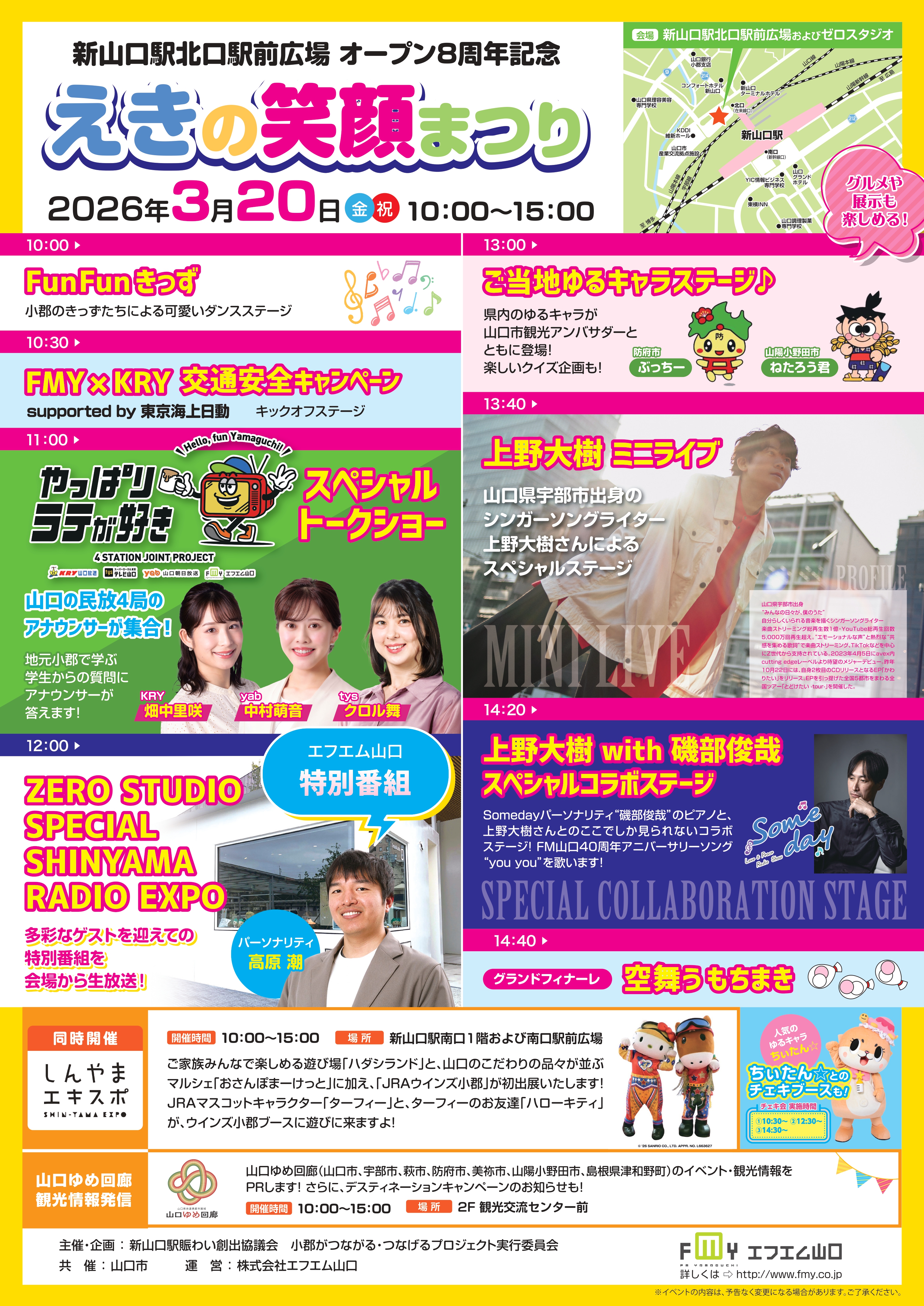 新山口駅北口広場オープン8周年記念!えきの笑顔まつりが今年も開催!当日はFMY公開放送をはじめ、スペシャルトークイベント、上野大樹さんのミニライブにもちまきなど、多彩なゲストとスペシャルイベントで駅がにぎわいます! ■山口ゆめ回廊特設ブース開設